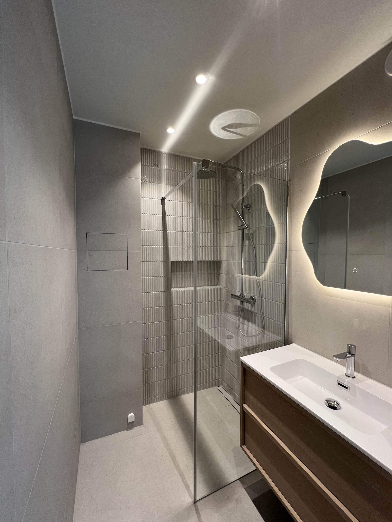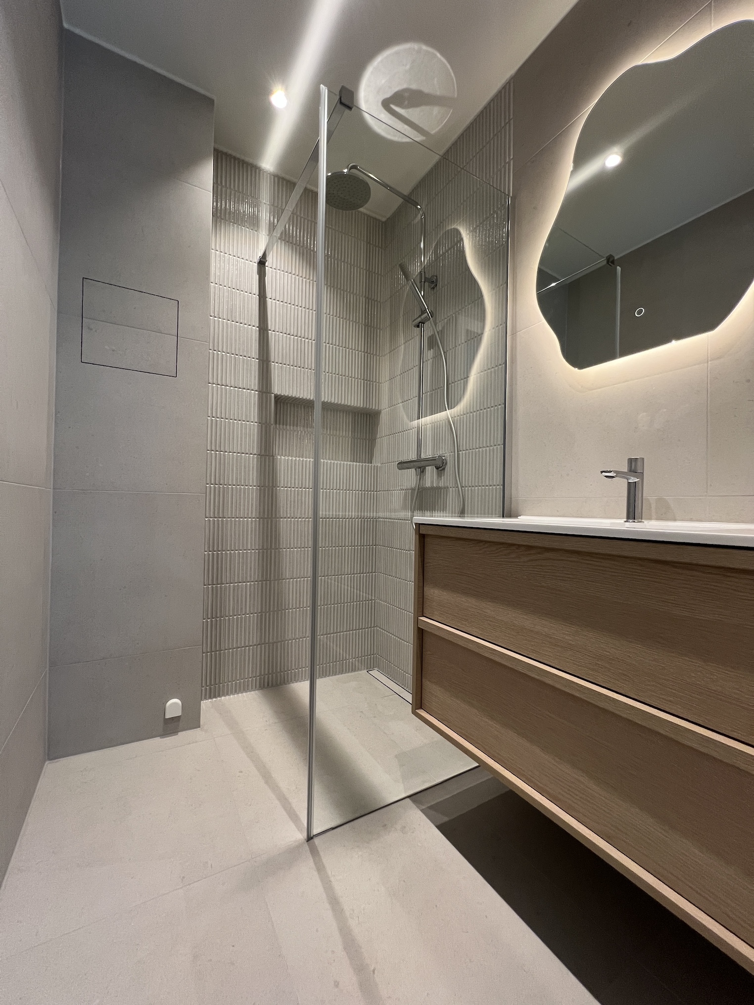 • Valgt moderne og stilrene fliser i dusjsonen