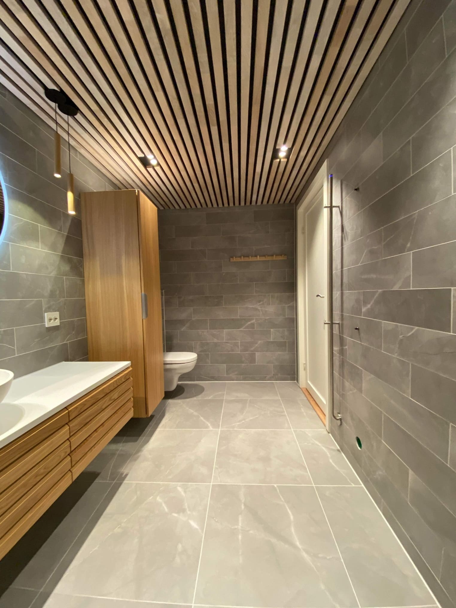Vi startet med å legge store, elegante grå fliser på både gulv og vegger for å gi en rolig og eksklusiv atmosfære. Et trekledt tak med unike lameller tilfører varme og kontrast til de kjølige overflatene. For belysning valgte vi en kombinasjon av LED-speil og pendellamper som gir både praktisk lys og en estetisk effekt.