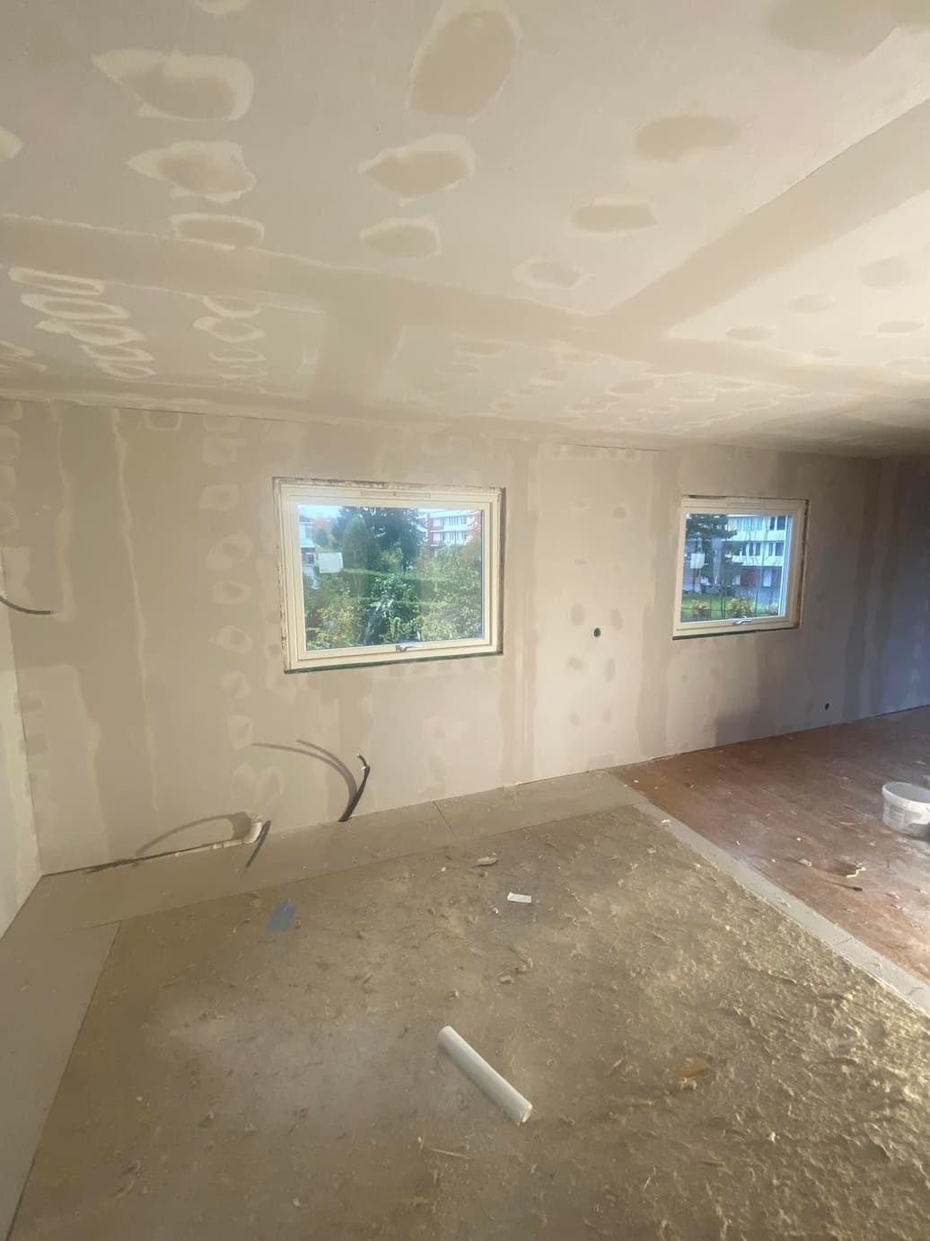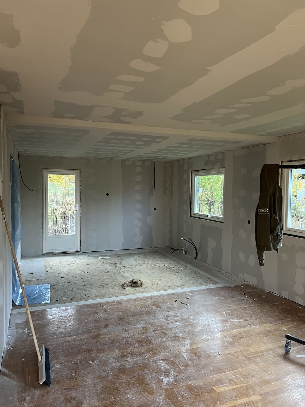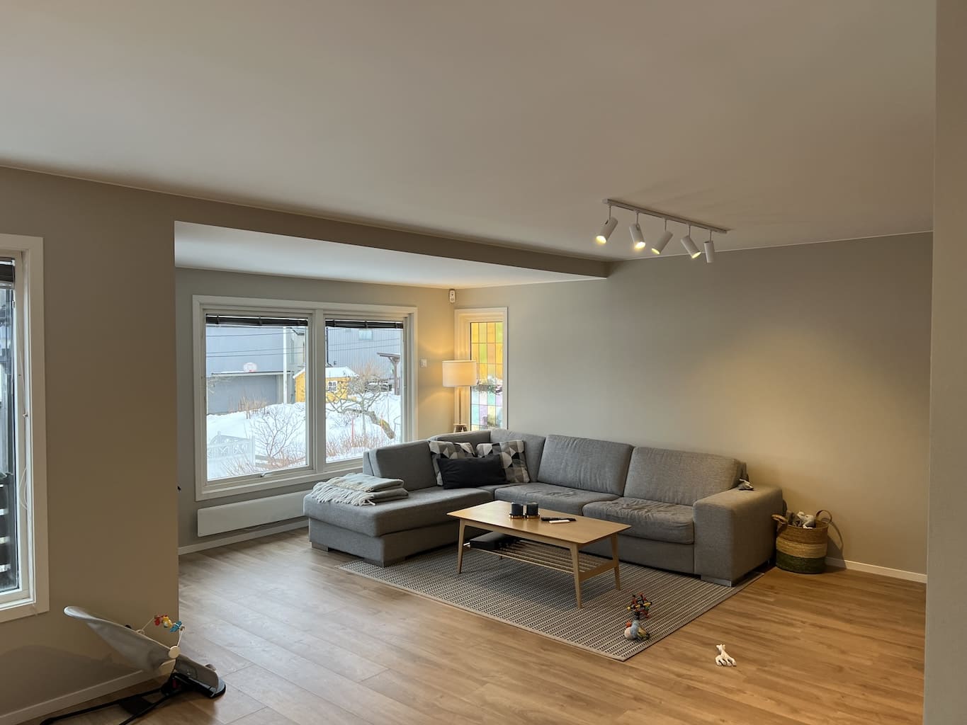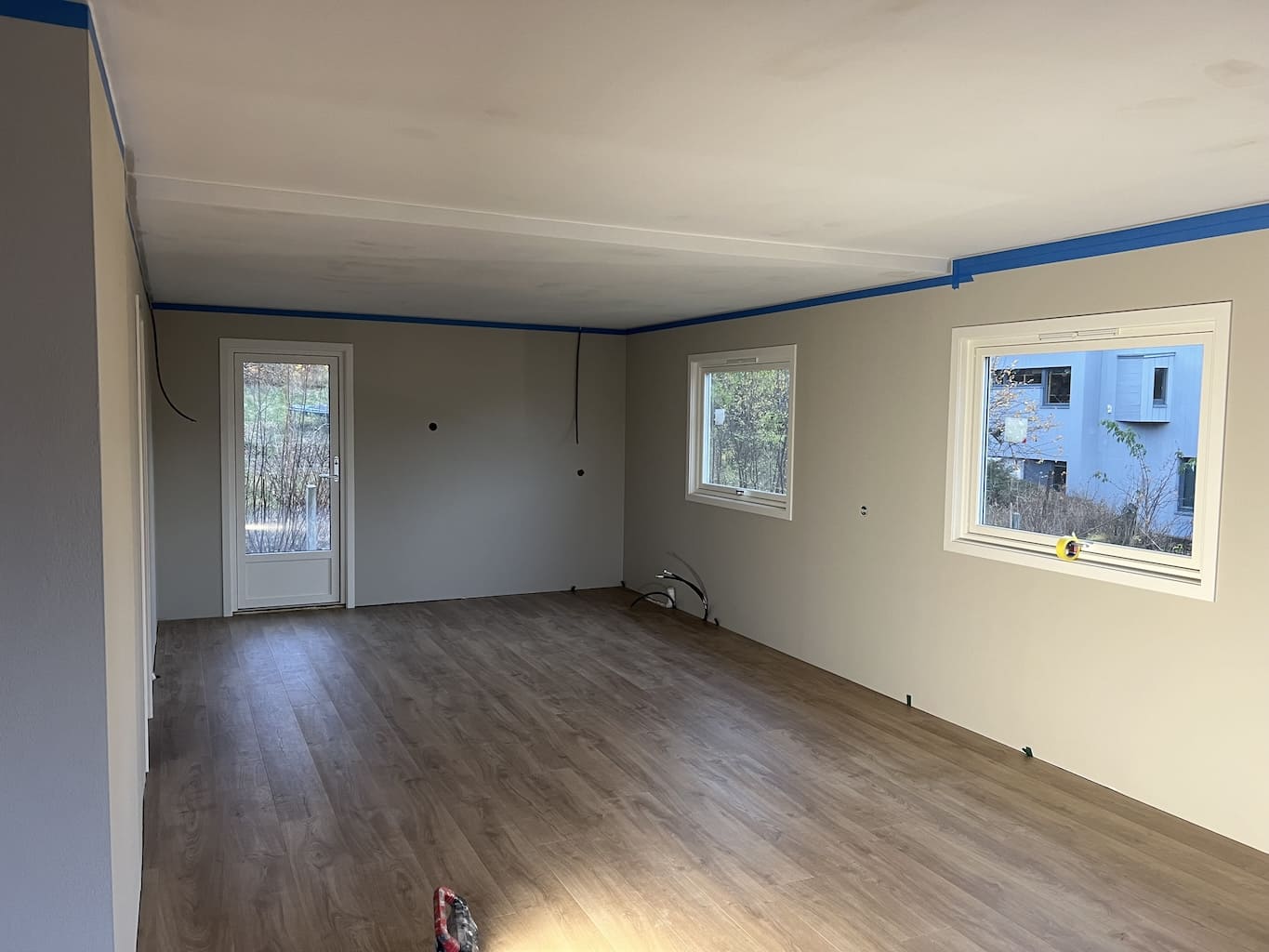 Denne totalrenoveringen forvandlet en eldre stue til et moderne, funksjonelt og estetisk tiltalende oppholdsrom. Tidligere var rommet preget av utdaterte overflater, begrenset lysinnslipp og en trang romfølelse. Ved å åpne opp rommet, installere ny belysning og bruke lyse, varme fargetoner, skapte vi en innbydende atmosfære.