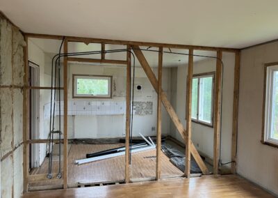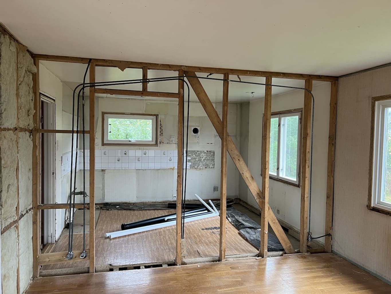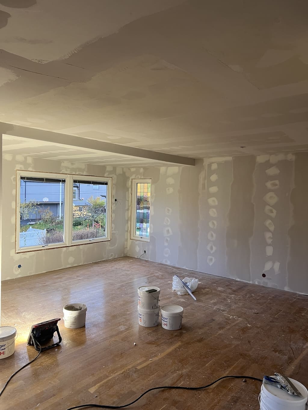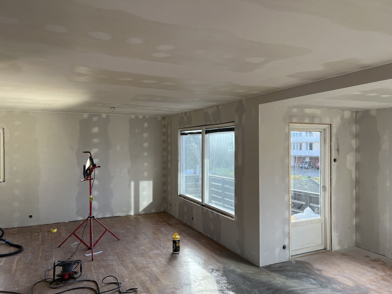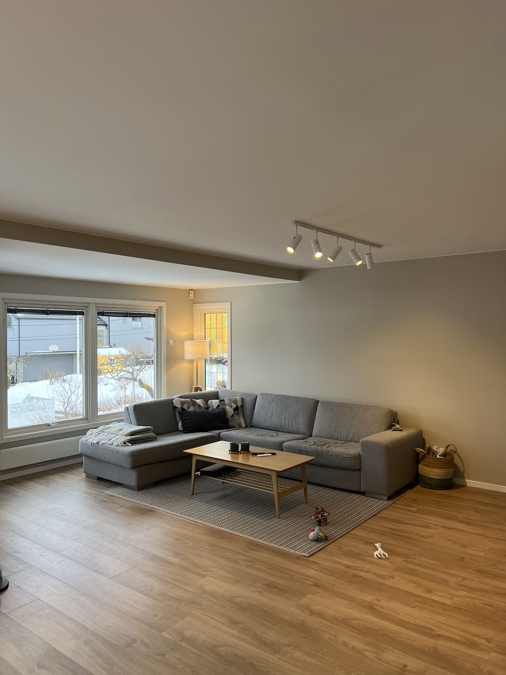 Denne totalrenoveringen forvandlet en eldre stue til et moderne, funksjonelt og estetisk tiltalende oppholdsrom. Tidligere var rommet preget av utdaterte overflater, begrenset lysinnslipp og en trang romfølelse. Ved å åpne opp rommet, installere ny belysning og bruke lyse, varme fargetoner, skapte vi en innbydende atmosfære.
