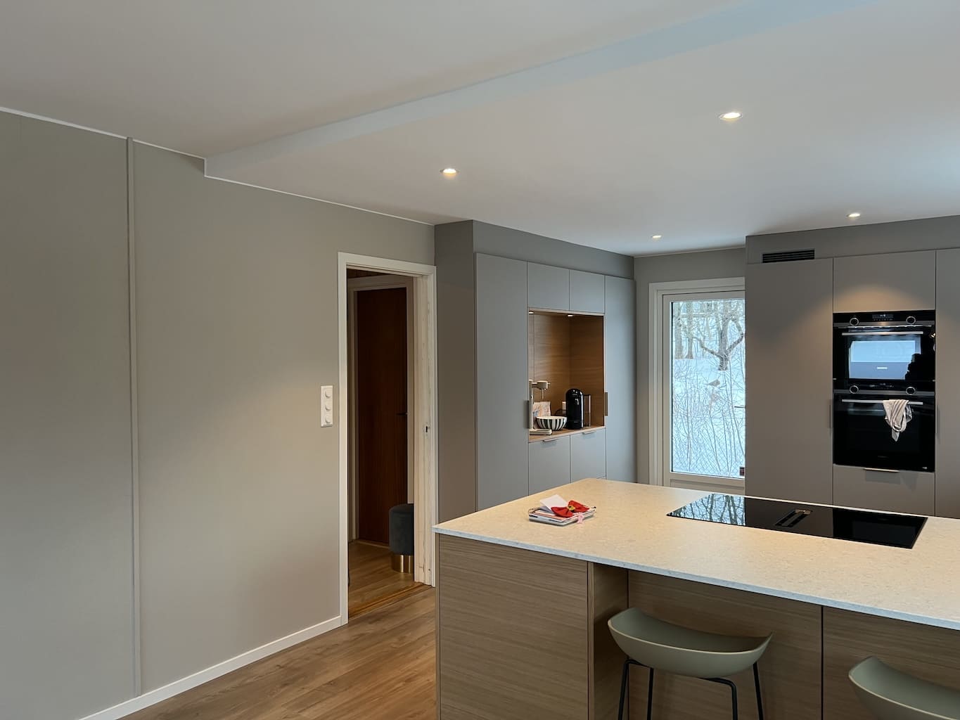 Vi oppgraderte gulvet med kvalitetsparkett for en naturlig og varm følelse, mens kjøkkenet fikk et moderne design med en åpen løsning og en stilren kjøkkenøy som binder sammen rommet. Med gjennomført håndverk og smarte løsninger har vi skapt et rom som både er praktisk og elegant – perfekt for både hverdagsliv og sosiale sammenkomster.